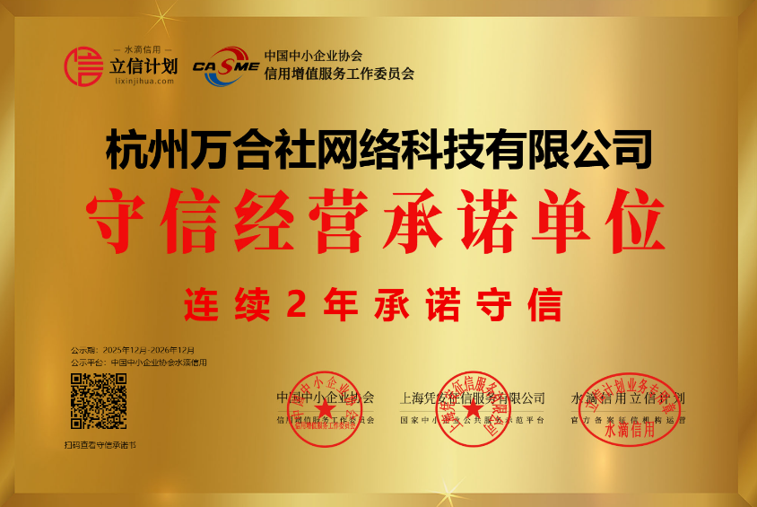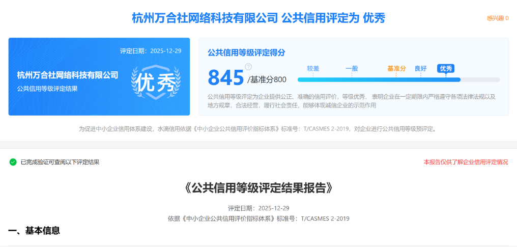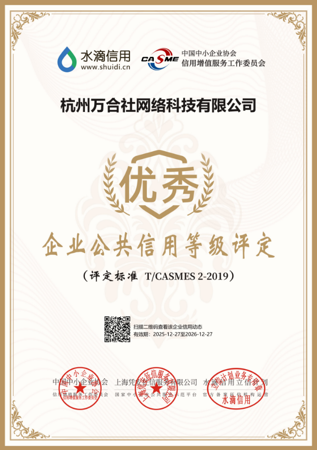 近日,杭州万合社网络科技有限公司(以下简称“杭州万合社”)获得国内权威信用评级机构——水滴信用评级的最高级“优秀”中小企业公共信用等级评定。杭州万合社荣获水滴信用中小企业最高等级评定,标志着公司在经营能力、风险管控及发展潜力方面获得市场高度认可。